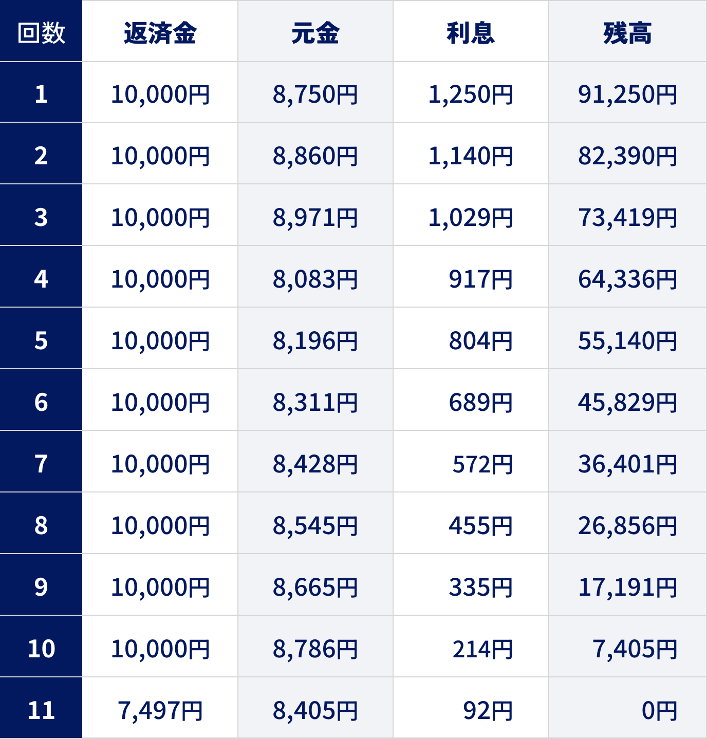 主な返済例 (実質年率15.00%で10万円を借り、30日ごとに1万円ずつ返済する場合)